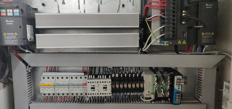 Panel de control: el motor principal funciona con una unidad de accionamiento de frecuencia variable, que se caracteriza por tener un bajo consumo de energía y una alta eficiencia. Control PLC e Interfaz hombre-máquina (HMI): La pantalla muestra el estado operativo y los datos de la máquina; además todos los parámetros se pueden configurar en la pantalla.